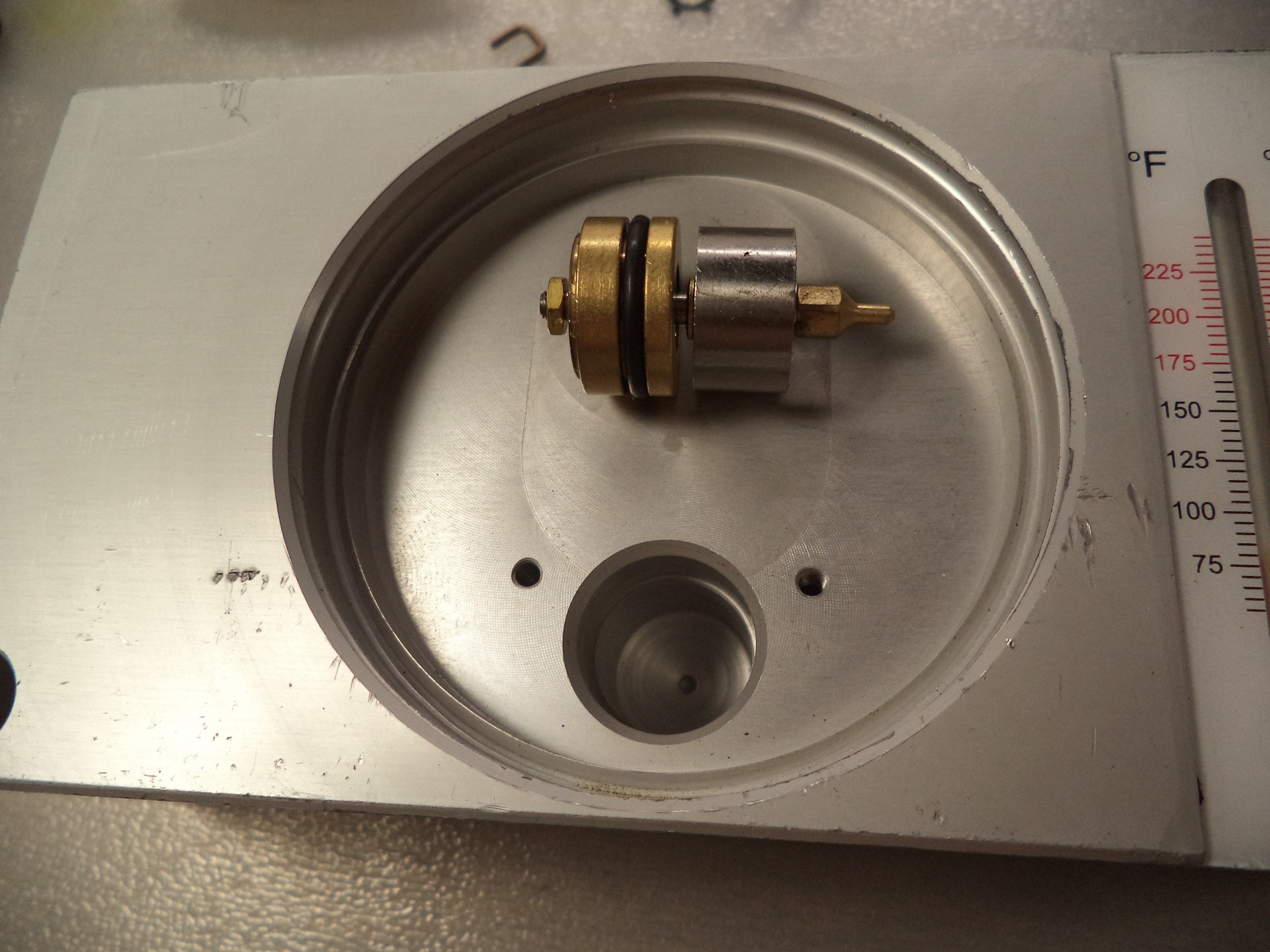 There's not much else to see from the outside, so let's have a look at what's inside now. One can see the sharp-edged orifice and nose of the moving tapered metering piston in the inlet port and the spring in the outlet port: