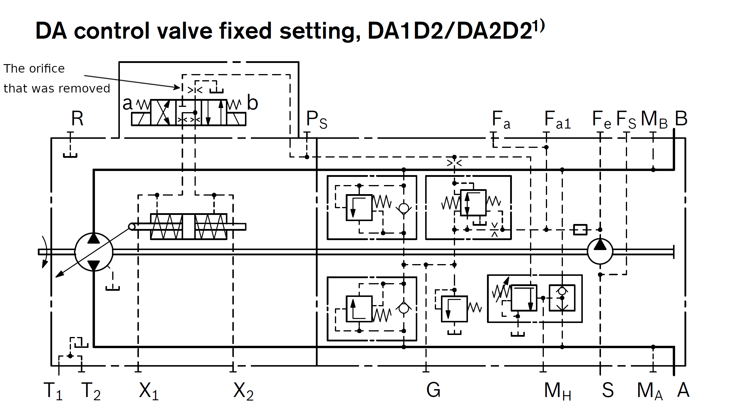 Suspecting control issues, I installed a metric thread measuring fitting into the forward servo cylinder, took the pressure reading, then did the same thing to the reverse side. The control pressure coming from the DA (automotive) valve, with the motor accelerating at 2200 rpm, was around 25 bar for both sides, which was supposed to be more than enough to maintain the maximum pressure of 420 bar. The reason I was measuring one side at a time was very simple - I only had one fitting with the metric thread in my toolbox at the time. Apparently, the servo pressure was not the problem...