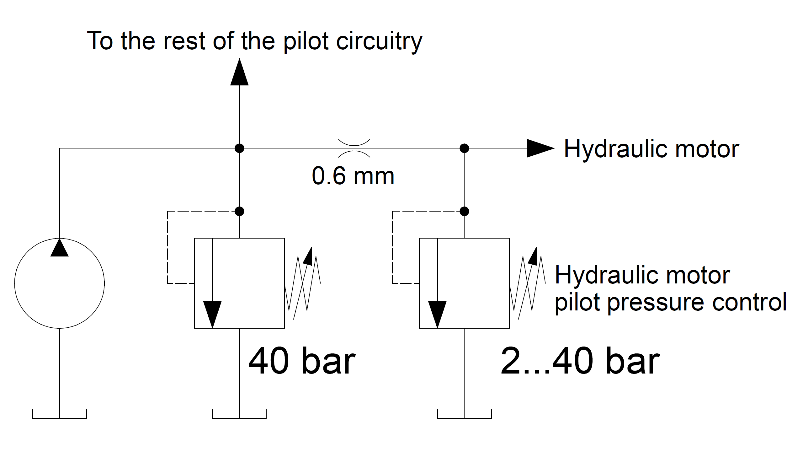 So - I began looking for problems in the pilot circuit. Take a look at the hydraulic diagram and tell me what can go wrong for it not to be able to supply sufficient pilot pressure to the motor displacement control? The orifice? We checked it and it was OK. The relief valve? - Also OK! Is the pilot pressure source too low? Nope - solid 40 bar! Hmm... Any more ideas?