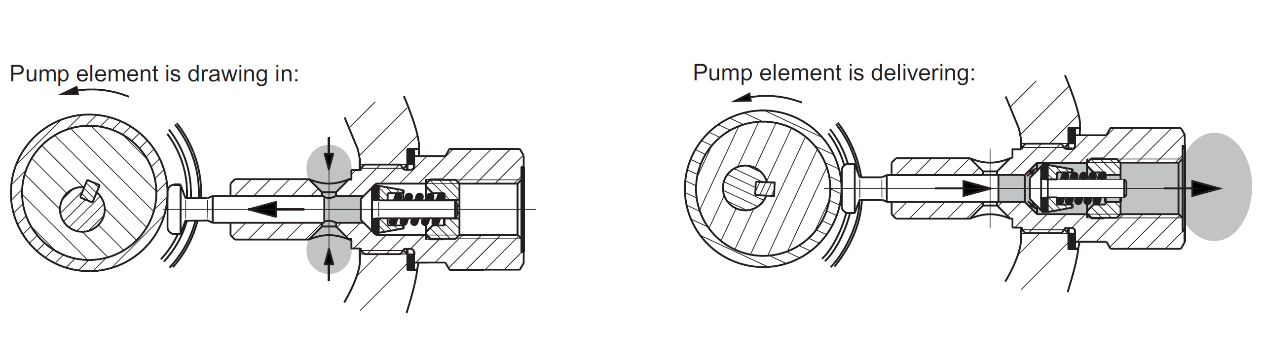 These pump elements are super simple - they only have one single check valve at the outlet, and their suction phase relies on the pumped medium filling the vacuum pocket behind the retracting piston through the side holes in the sleeve: